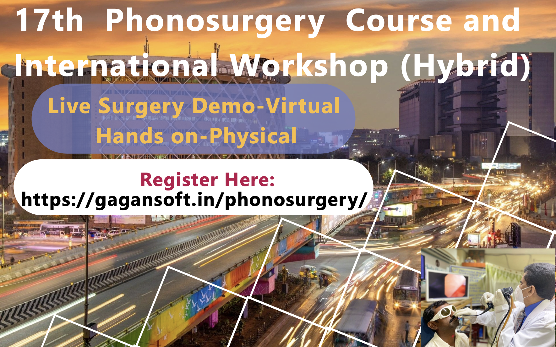 We cordially invite you for our 17th Phonosurgery course and International workshop on Hybrid basis on 28th and 29th of October 2023. On 28th October there will be LIVE SURGICAL DEMO on Office Based Laryngeal Surgeries and Phonomicrosurgeries and LECTURES by eminent National and Intenational Faculty on Virtual (Zoom) basis. On 29th October we will conduct HANDS ON TRAINING (Goat Larynx) on Thyroplasty with Arytenoid adduction technique,Injection Laryngoplasty and Office based Laryngeal Procedures at Century Hospital Road No 12, Banjara hills, Hyderabad. Probably this is the first dual or hybrid concept based Phonosurgery workshop from India designed for the convenience of the delegates saving their time and money. This Course is organized in association with Association of Phonosurgeons of India, India Chapter of Voice Foundation (USA) and AOI telangana, Hyderabad, Telangana SLP association and Sri Sathya Sai Institute of ENT and Melody Voice Clinic, Guntur, A.P.