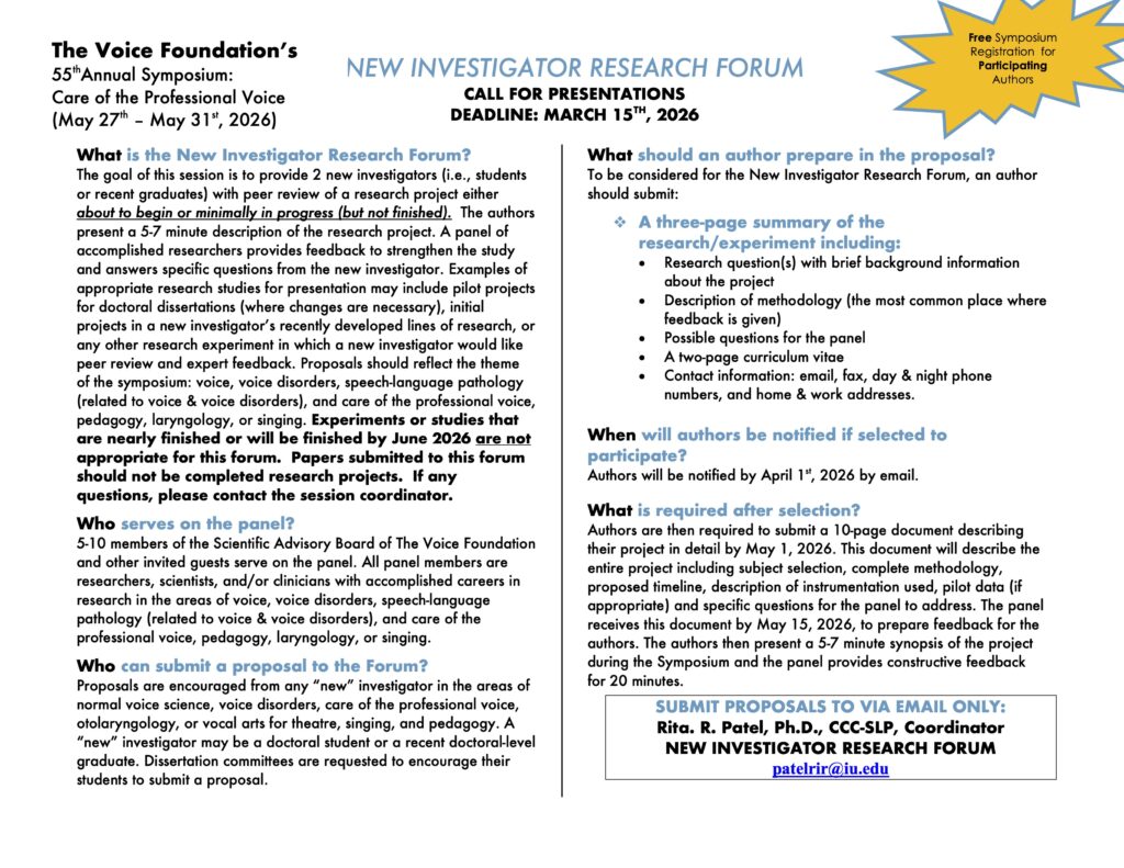 - Proposals should reflect the theme of the symposium: voice, voice disorders, speech-language pathology (related to voice & voice disorders), care of the professional voice, pedagogy, laryngology, or singing.