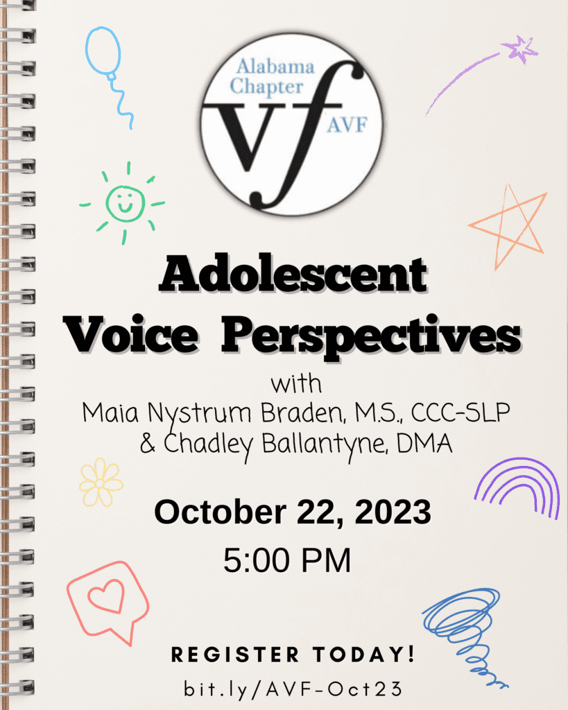 Our October presentation of the Alabama Chapter of the Voice Foundation is geared towards our members & friends who work with the adolescent voice or are interested in working with the adolescent voice! We will host a discussion on “Adolescent Voice Perspectives” with Maia Nystrum Braden, M.S., CCC-SLP & Chadley Ballantyne, DMA.