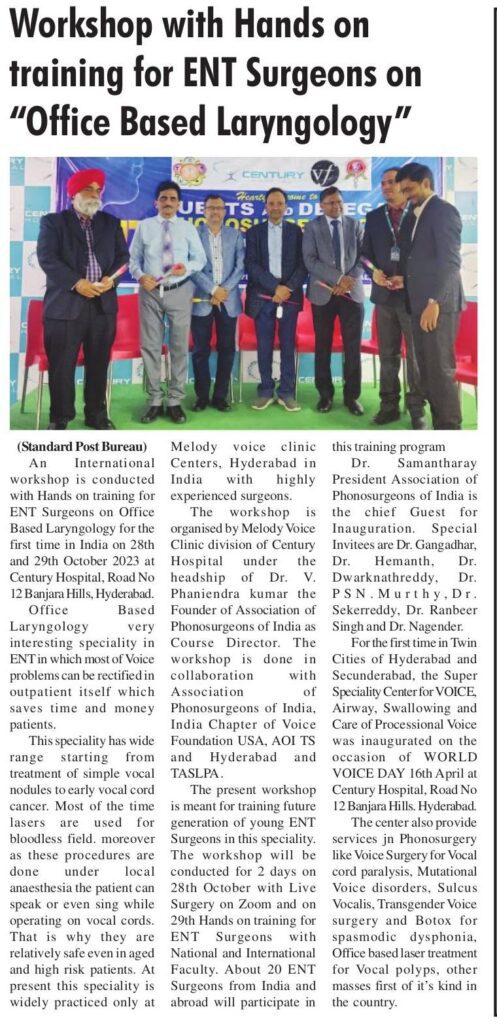 We cordially invite you for our 17th Phonosurgery course and International workshop on Hybrid basis on 28th and 29th of October 2023. On 28th October there will be LIVE SURGICAL DEMO on Office Based Laryngeal Surgeries and Phonomicrosurgeries and LECTURES by eminent National and Intenational Faculty on Virtual (Zoom) basis. On 29th October we will conduct HANDS ON TRAINING (Goat Larynx) on Thyroplasty with Arytenoid adduction technique,Injection Laryngoplasty and Office based Laryngeal Procedures at Century Hospital Road No 12, Banjara hills, Hyderabad. Probably this is the first dual or hybrid concept based Phonosurgery workshop from India designed for the convenience of the delegates saving their time and money. This Course is organized in association with Association of Phonosurgeons of India, India Chapter of Voice Foundation (USA) and AOI telangana, Hyderabad, Telangana SLP association and Sri Sathya Sai Institute of ENT and Melody Voice Clinic, Guntur, A.P.