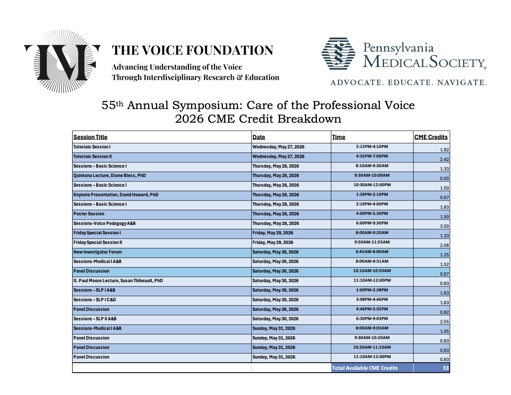 This activity has been planned and implemented in accordance with the accreditation requirements and policies of the Accreditation Council for Continuing Medical Education (ACCME) through the joint providership of the Pennsylvania Medical Society and The Voice Foundation. The Pennsylvania Medical Society is accredited by the ACCME to provide continuing medical education for physicians.